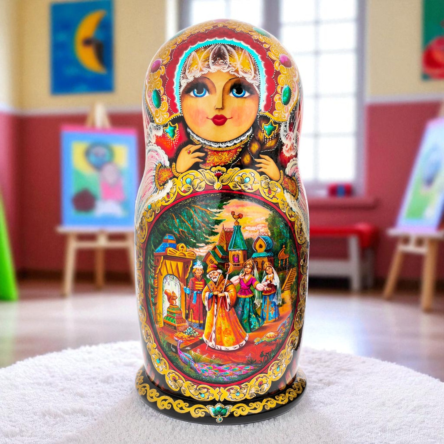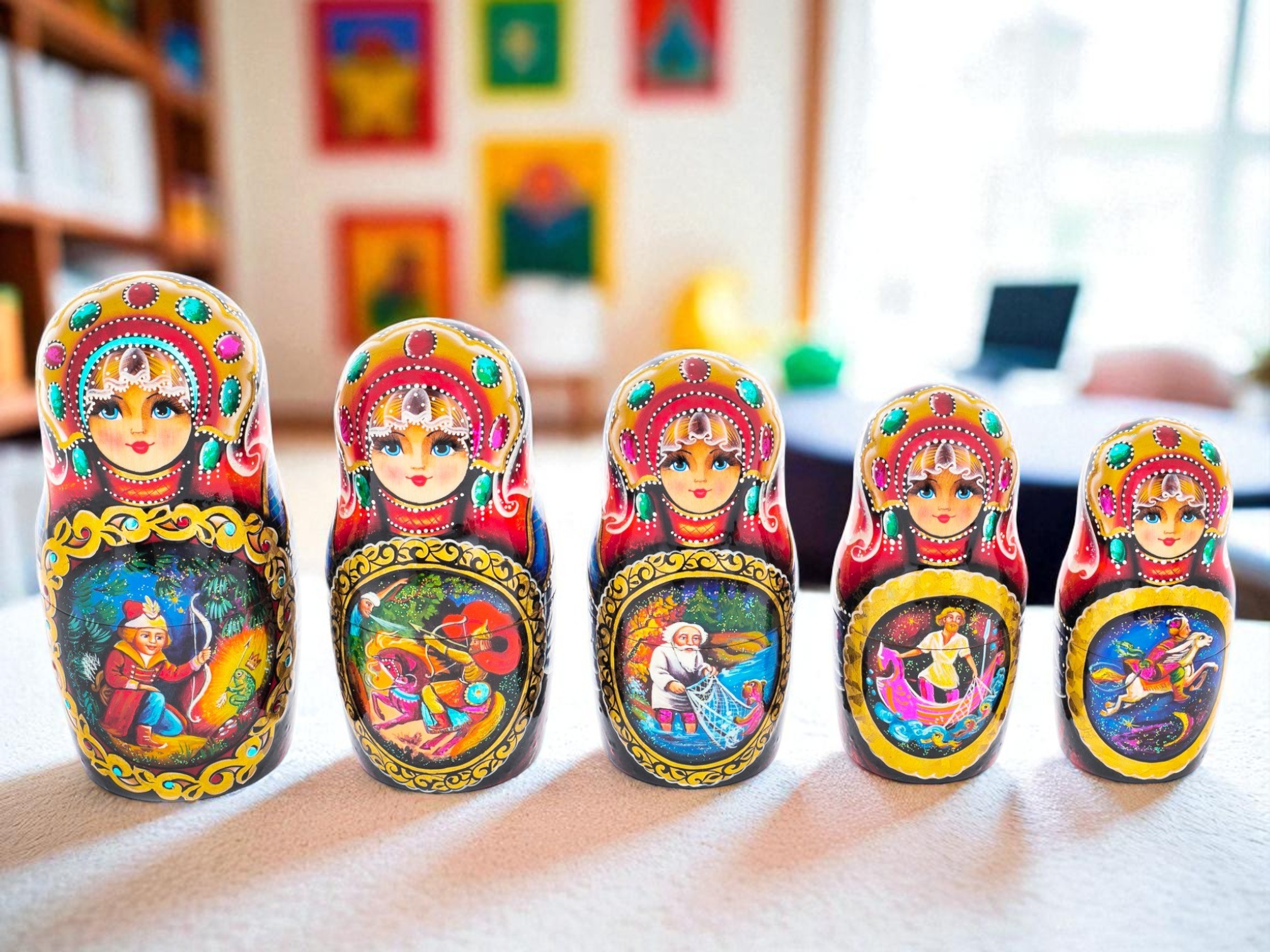 Phần tuyệt vời nhất của những con búp bê MATRYOSHKA là những bức tranh được vẽ bằng tay theo cách rất chân thực. Các bức tranh của bộ Matryoshka này vẽ các câu chuyện cổ tích dân gian nổi tiếng nhất của xứ sở Bạch Dương, được vẽ bằng tay theo phong cách hội họa truyền thống “Fedoskino”. Có hoa văn vàng tinh xảo được làm xung quanh tiểu cảnh.
